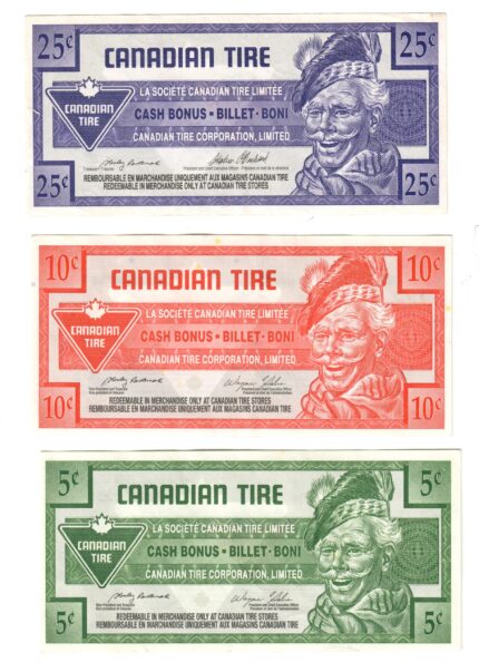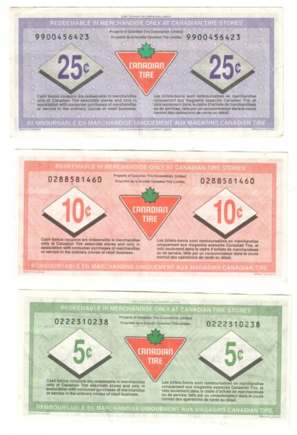 3 stk Canadian Tire money, 5¢, 10¢, 25¢