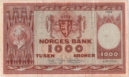 «1968 Norge 1000 Kroner A.3007943, 1-, Flekk» er lagt til handlekurven din. Vis handlekurv