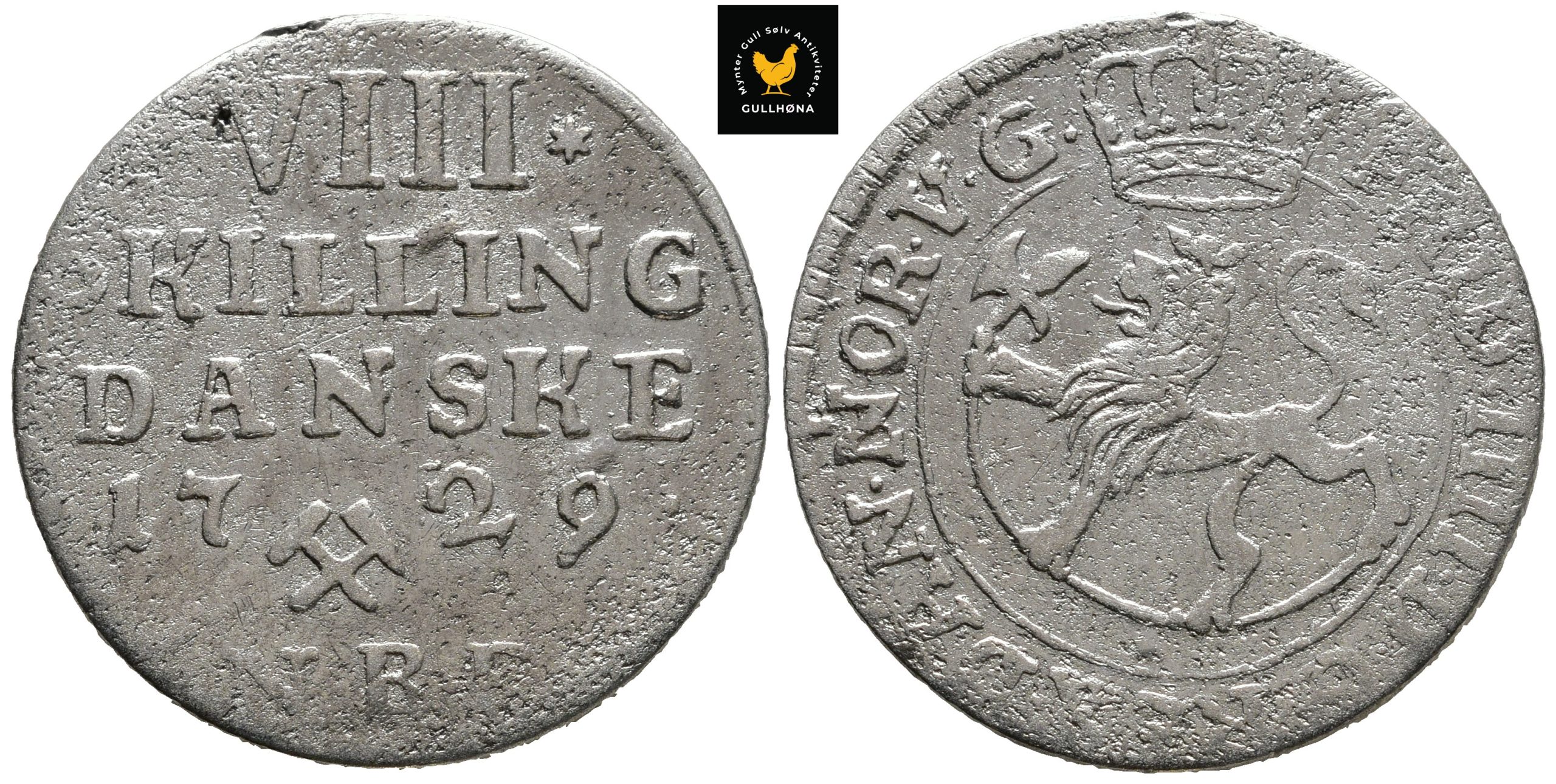 1729 Norge 8 Skilling, 1/1+, Renset
