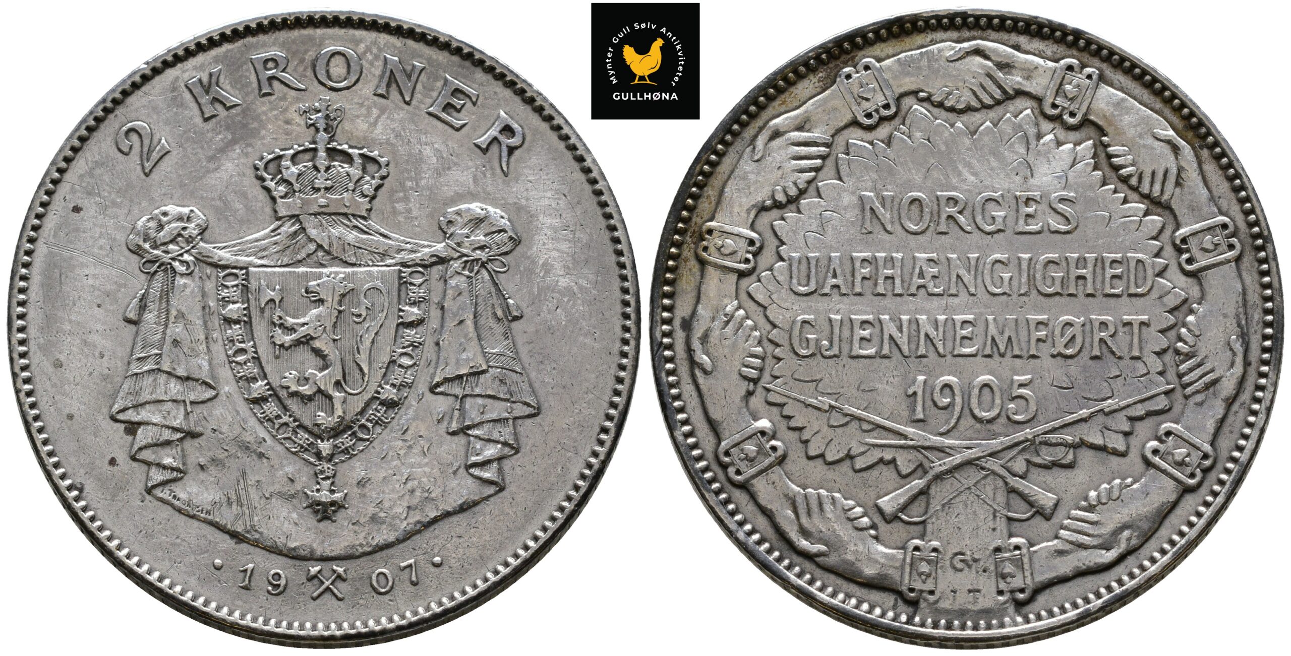 Hjem Mynter Mynter Norge Etter 1874 minnemynter Sølv 1907 Norge 2 Kroner m/ Gevær, 1+, Riper
