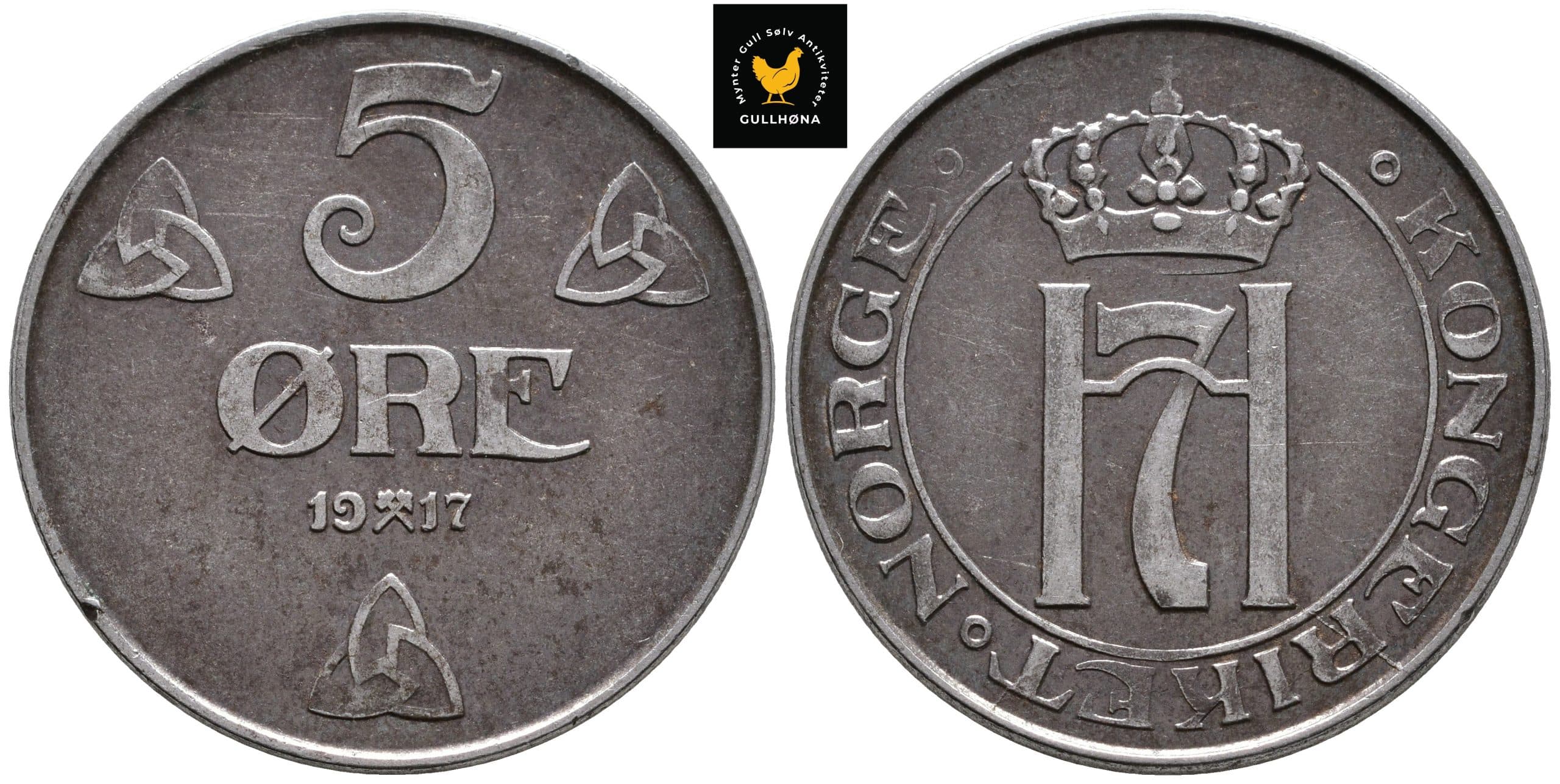 1917 Norge 5 Øre, 1+/01, Lite kanthakk