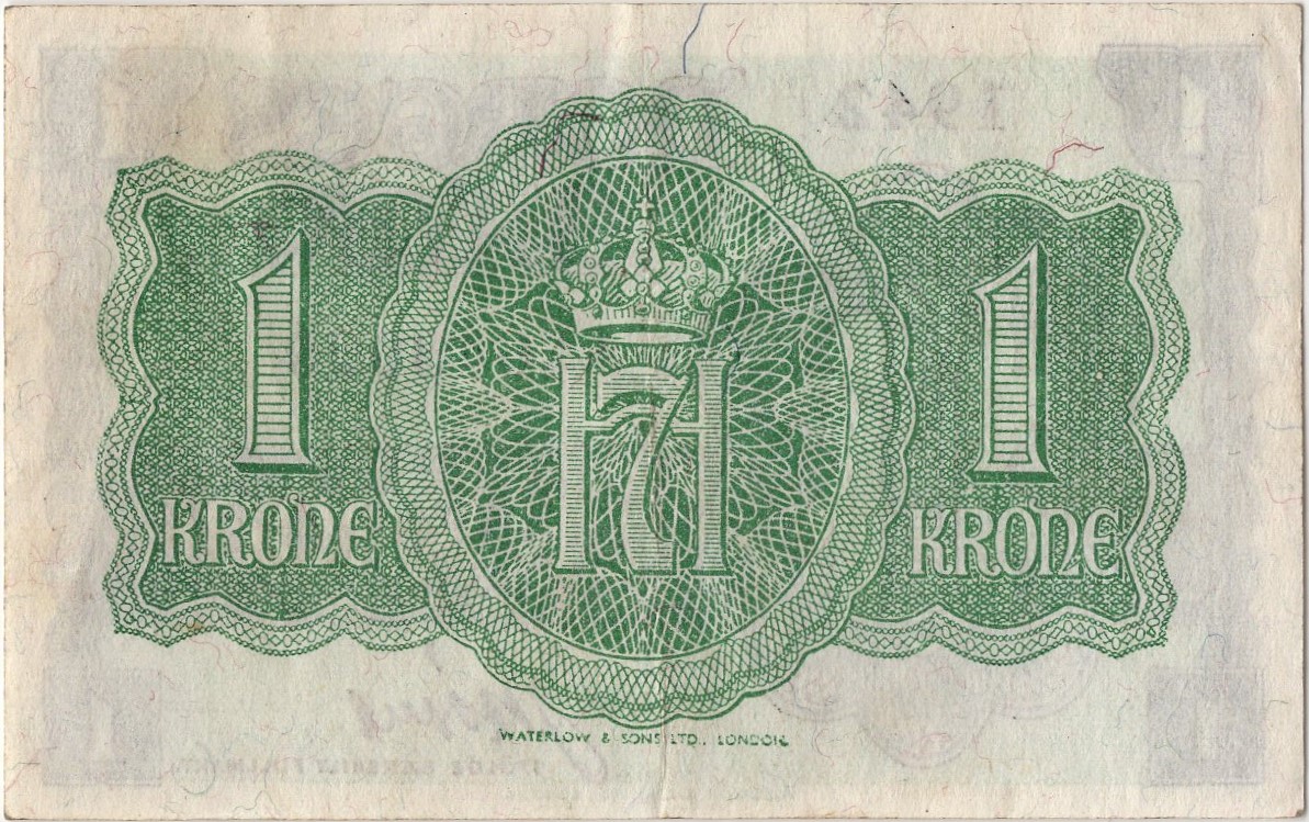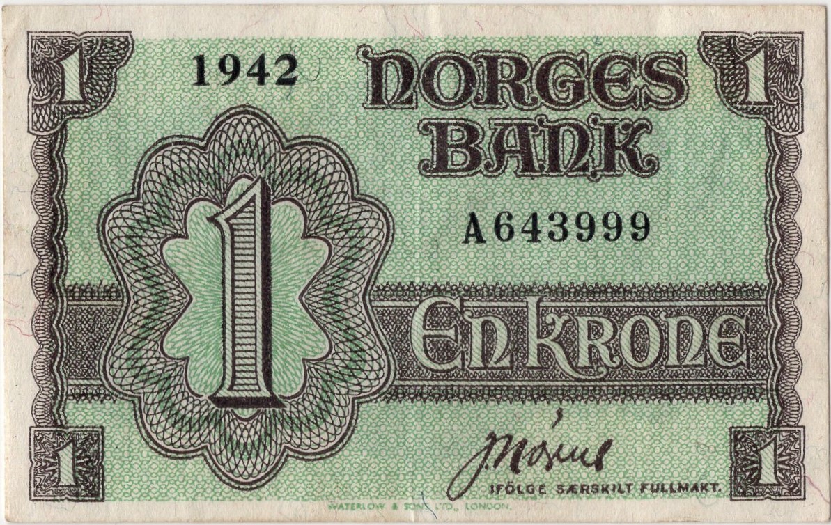 1942 Norge 1 Krone “London Seddel” A.643999, 1+/01