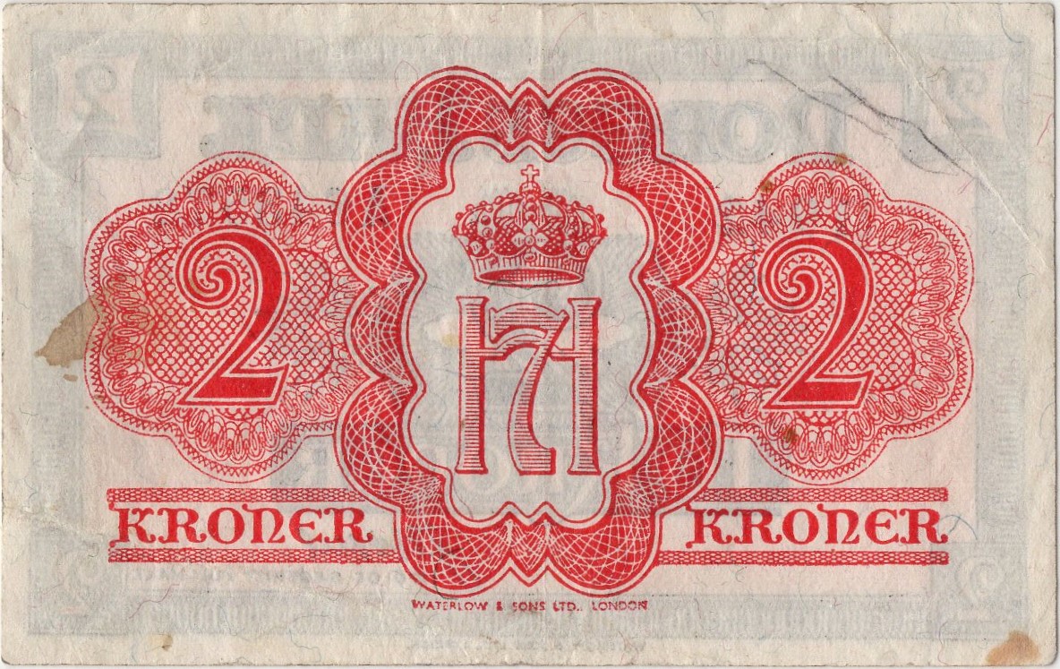 1942 Norge 2 Kroner “London Seddel” A.643572, 1, Flekker