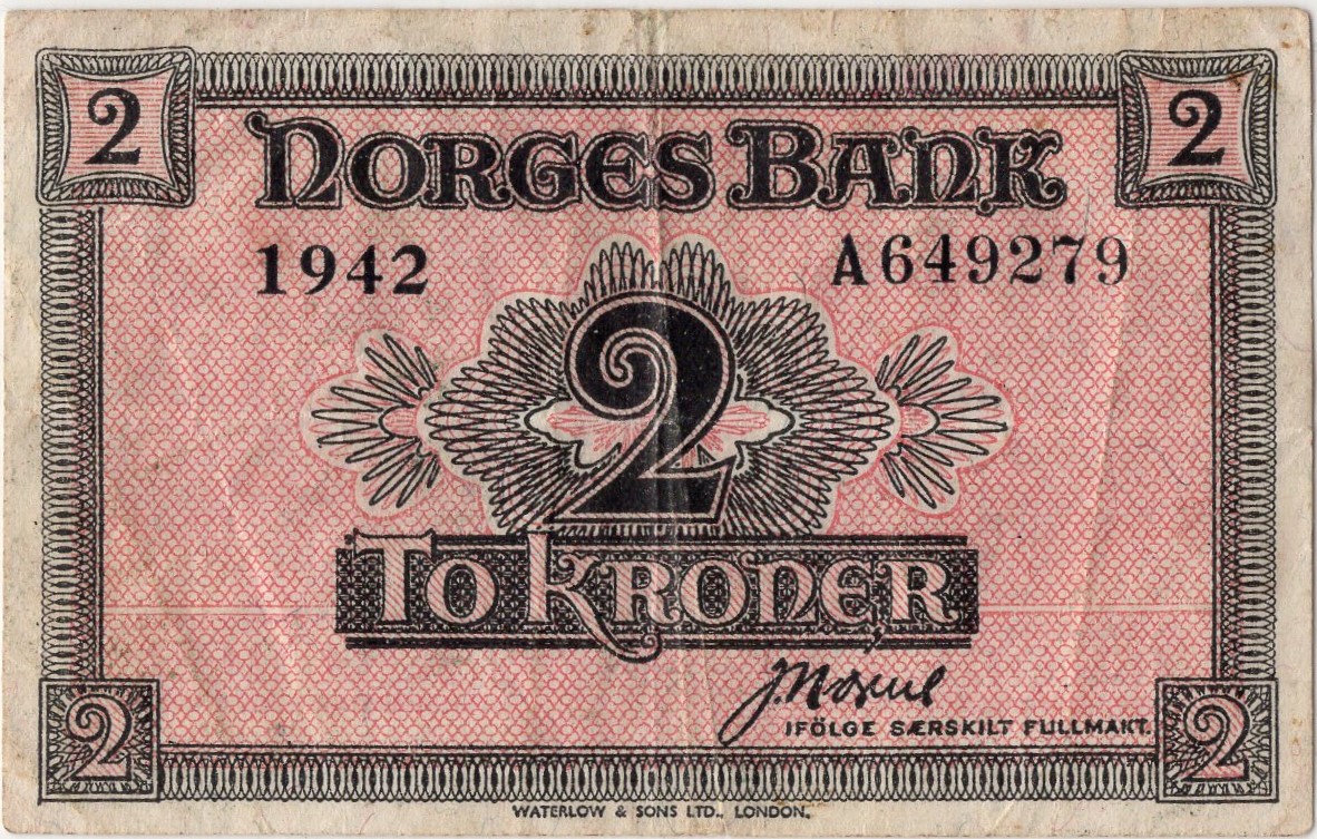 1942 Norge 2 Kroner “London Seddel” A.649279, 1/1-, Flekker