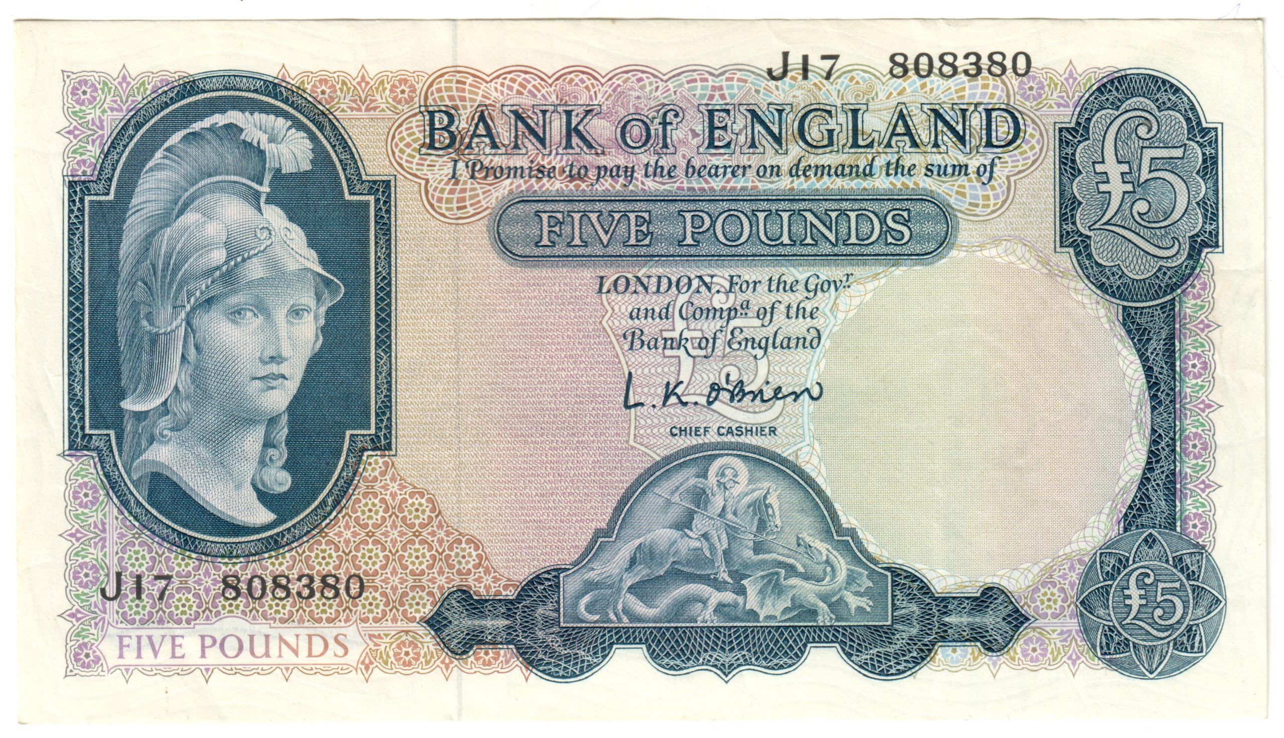 Britannia med hjelm til venstre, løve med nøkkel bak (Hvit £5 bak)