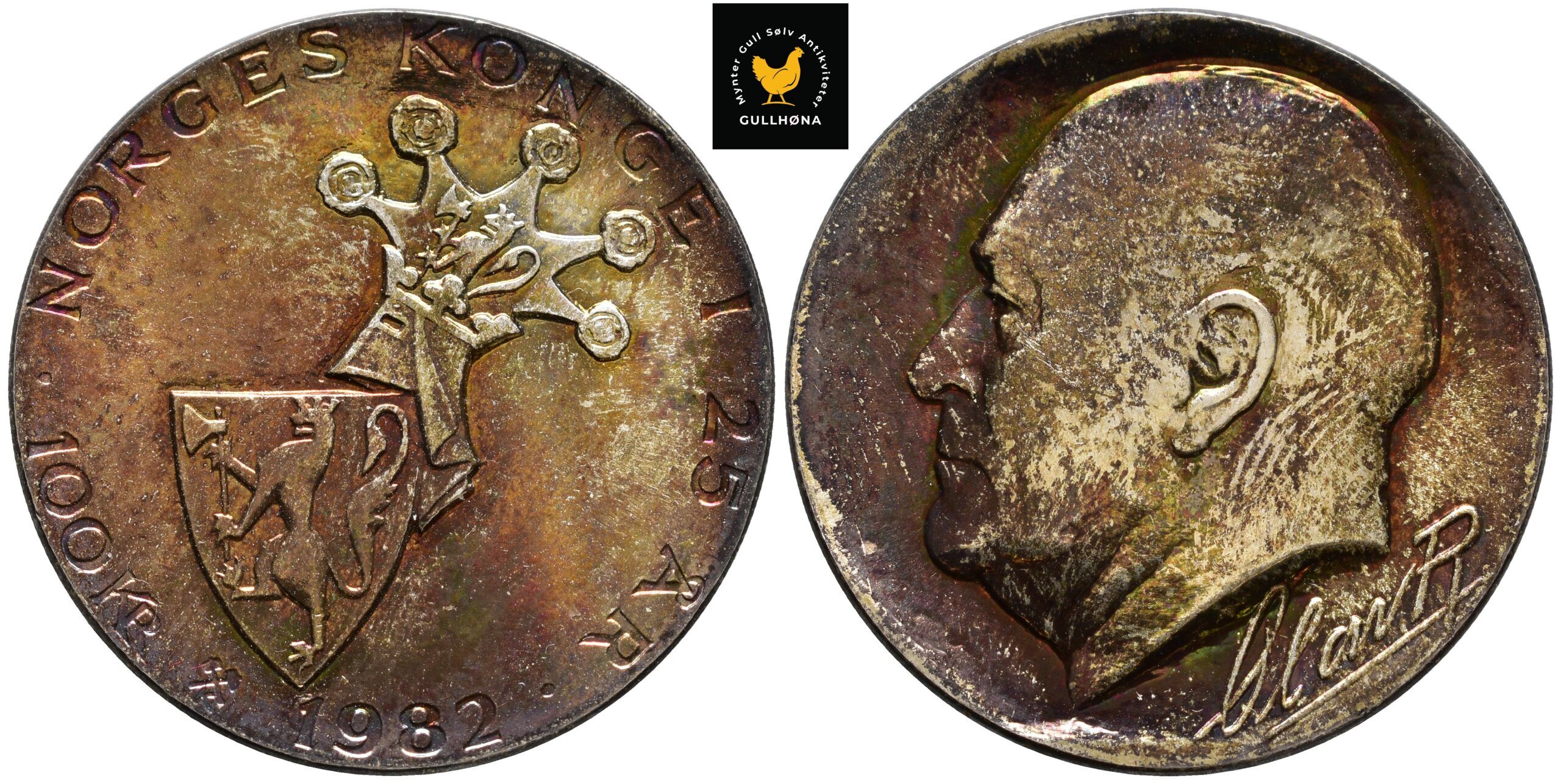 Norsk minnemynt i sølv utgitt av Norges Bank i 1982. Mynten hedrer Folkekongen Olav Vs 25-årsjubileum som norsk konge, og er Norges første 100-kronersmynt.