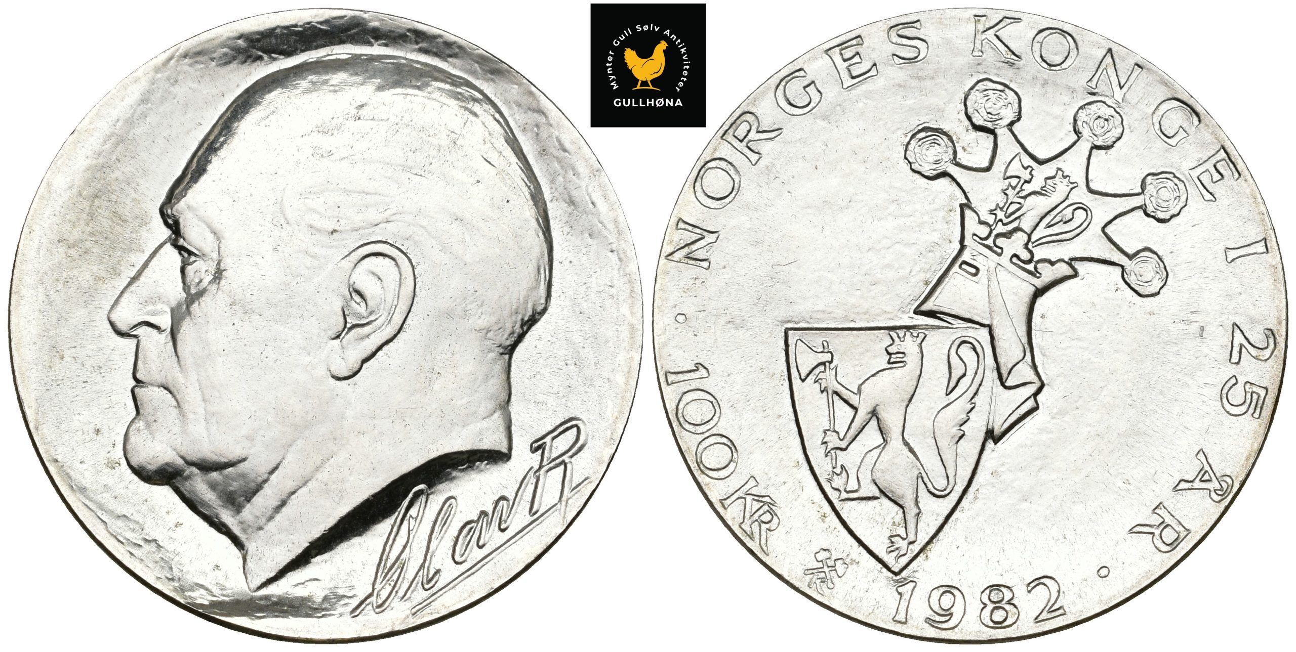 Norsk minnemynt i sølv utgitt av Norges Bank i 1982. Mynten hedrer Folkekongen Olav Vs 25-årsjubileum som norsk konge, og er Norges første 100-kronersmynt.