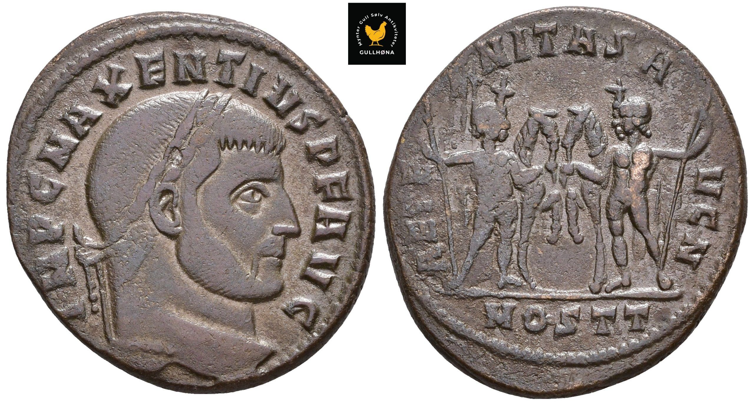 Maxentius (ca. 278-28. oktober 312 e.Kr) var sønn av den tidligere keiseren Maximianus (285-305 e.Kr), og ble valgt til ny keiser i Vestromerriket da Konstantin den Stores far, Constantius Chlorus, døde i 306 e.Kr. I denne perioden, kjent som tetrarkiet (fire personers styre) var makten i Romerriket delt mellom fire herskere. De to halvdelene av riket ble styrt av en keiser (augustus) og en «kronprins» (cæsar). Maxentius kom til makten på bekostning av Konstantin, som senere ble kjent som Den Store, og dette ble ikke godt mottatt. Det brøt ut krig mellom Konstantin og Maxentius, og det endelige slaget sto ved den Milviske bro i 312 e.Kr, et av anikkens mest kjente slag. Det var før dette slaget Konstantin skal ha hatt en visjon om et kors på himmelen, sammen med bokstavene ΧΡ (de greske bokstavene chi og rho, de første bokstavene i Christos, Kristus) sammen med frasen «I dette tegn skal du seire». Konstantin fikk sine legionærer til å male dette symbolet på sine skjold, og Konstantins hær gikk seirende ut av slaget. Slaget var et vendepunkt på flere måter, særlig ved at Kristendommen nå for alvor fikk fotfeste i Romerriket. Maxentius skal ha druknet i et forsøk på å flykte etter nederlaget.