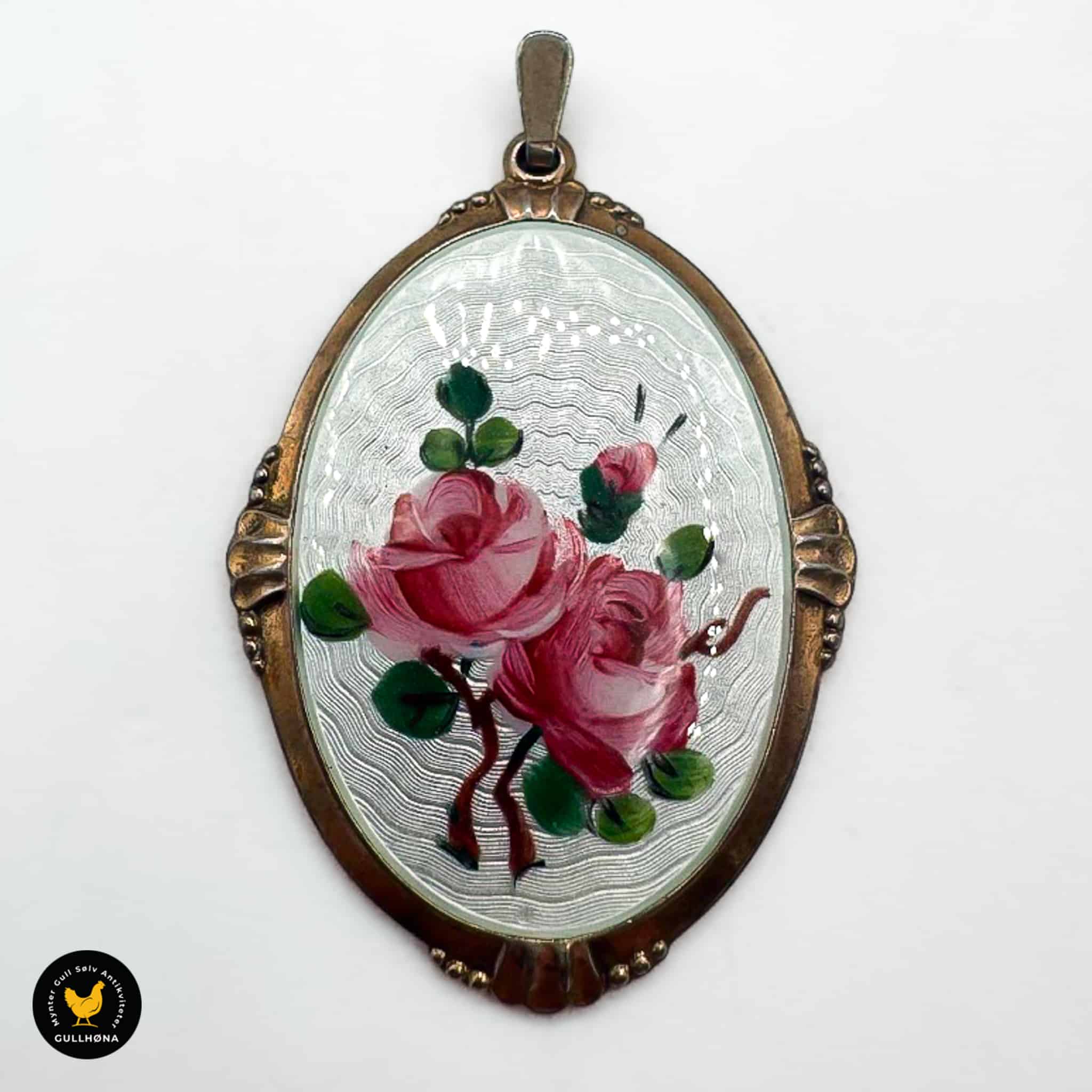 Anheng i forgylt sølv med emalje og rosemotiv