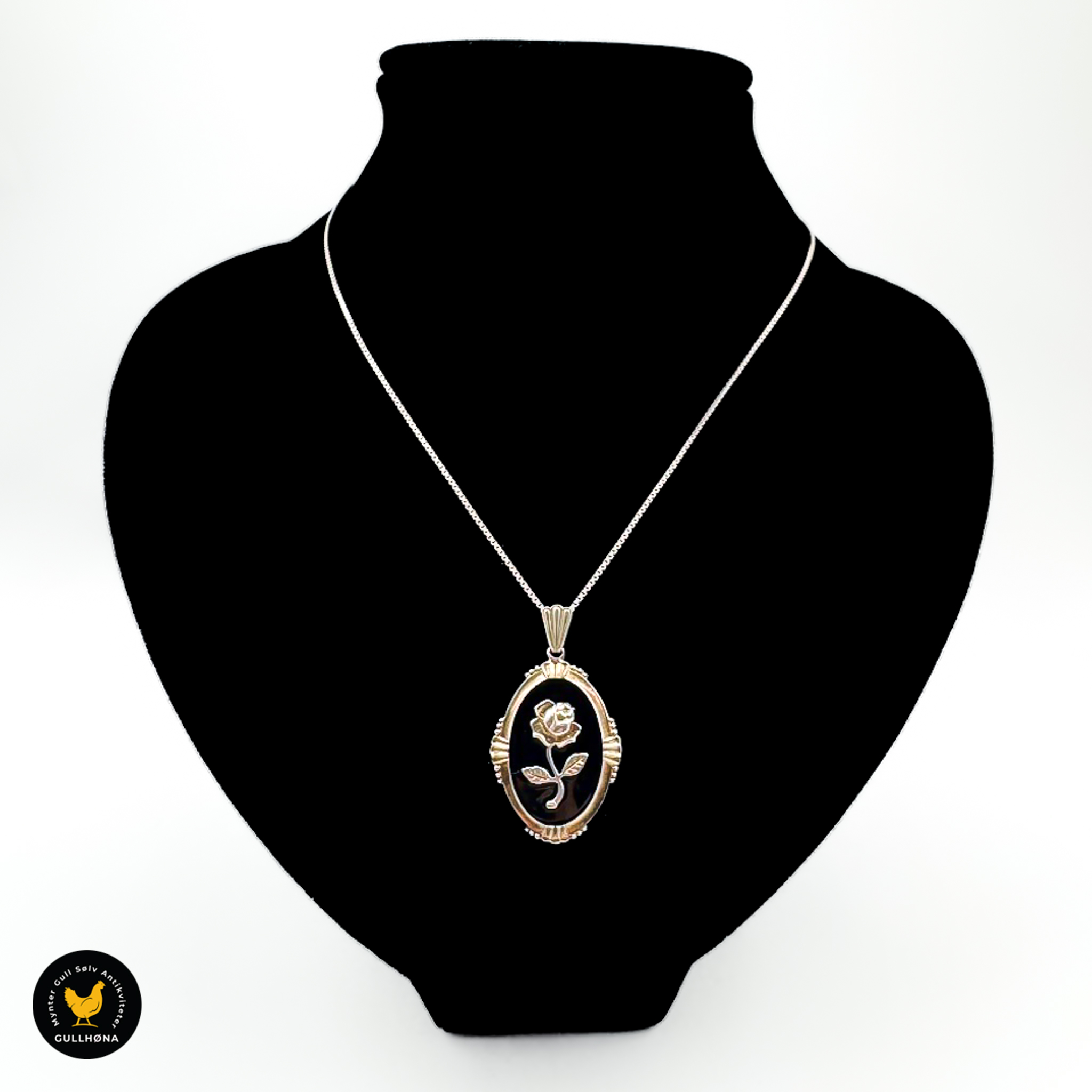 Anheng i forgylt sølv med svart emalje og rosemotiv