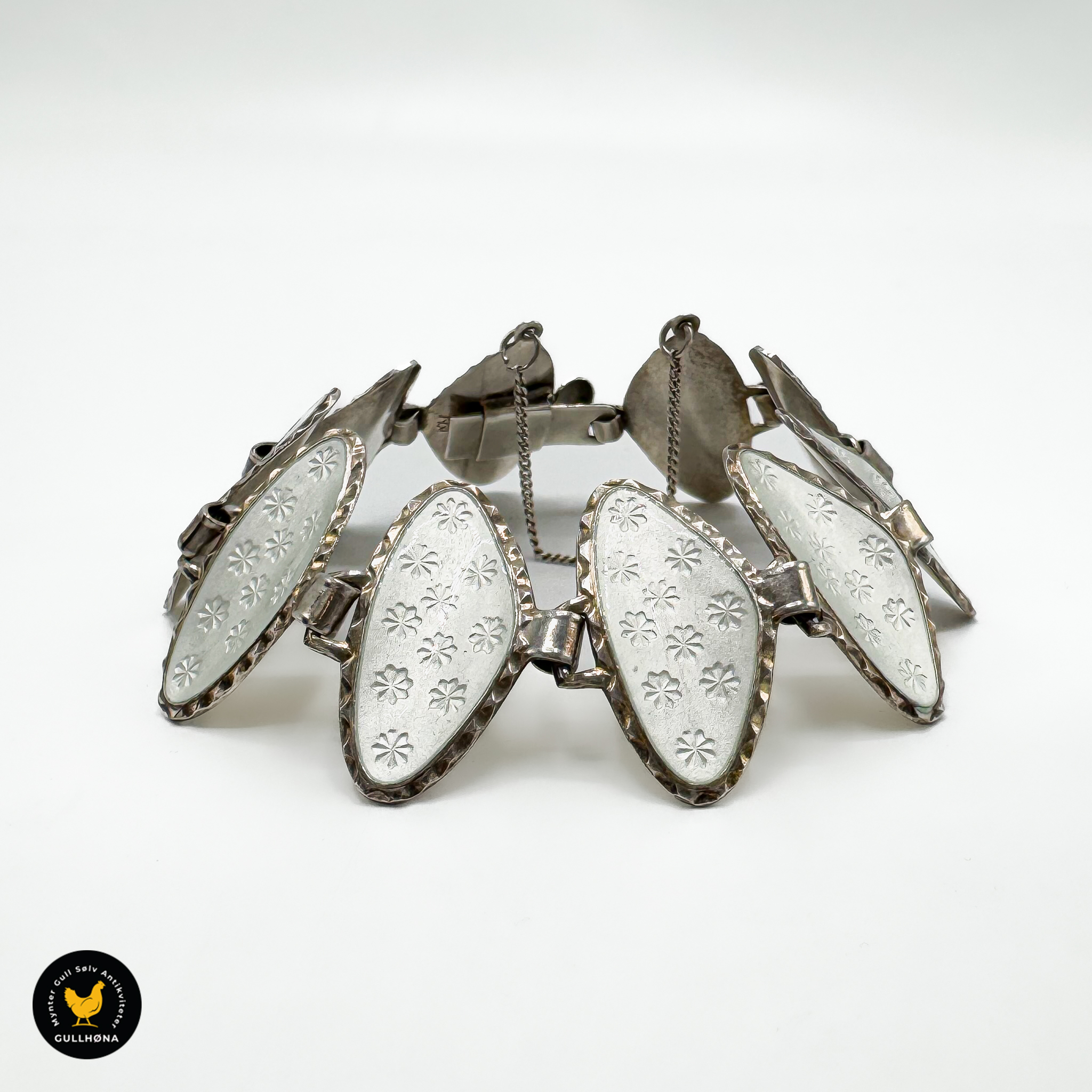 Nydelig armbånd med hvit emalje med snøfnugg-detaljer i god stand.