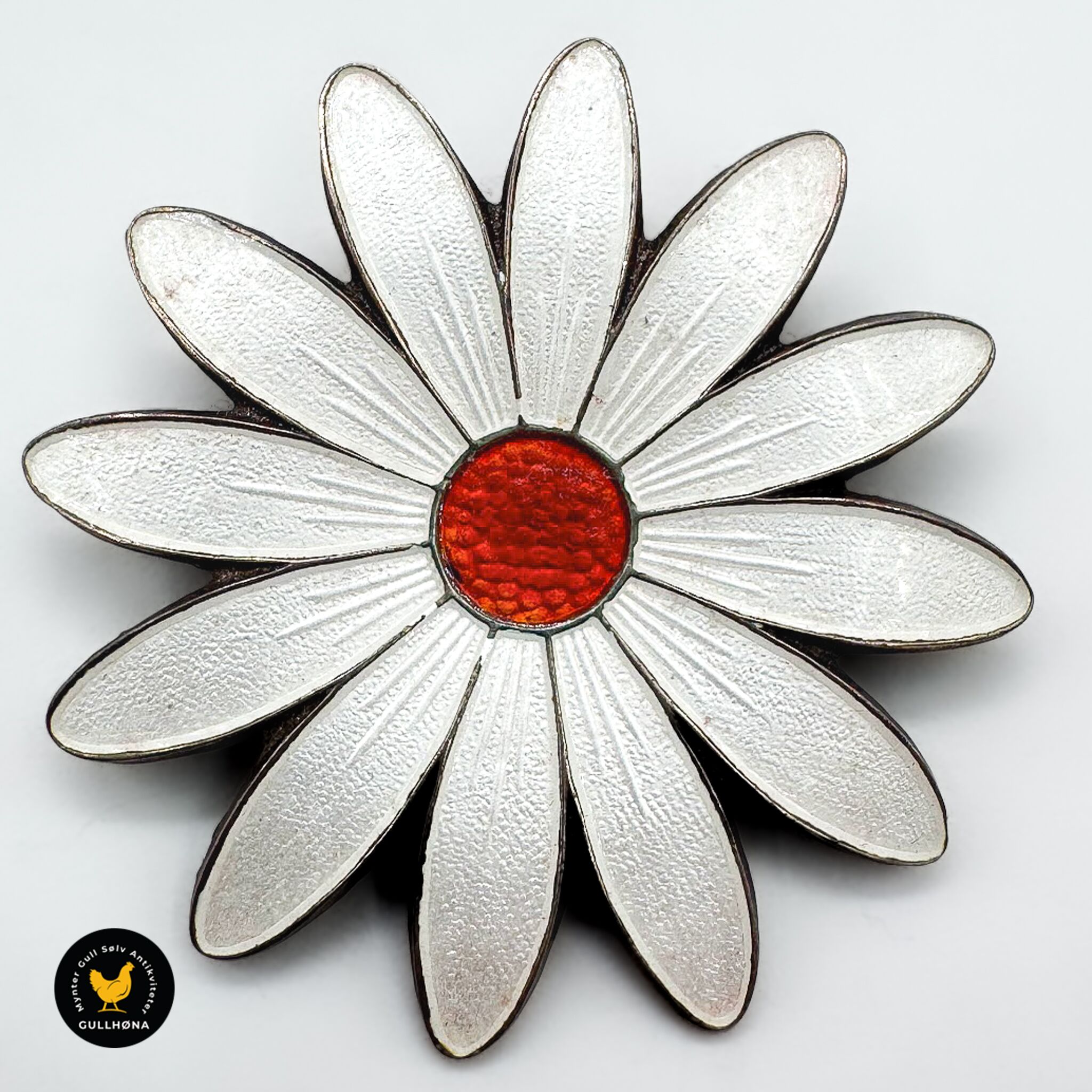 Flott blomst brosje i sølv med hvit og rød emalje.