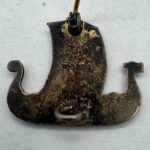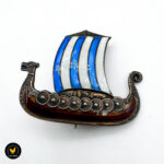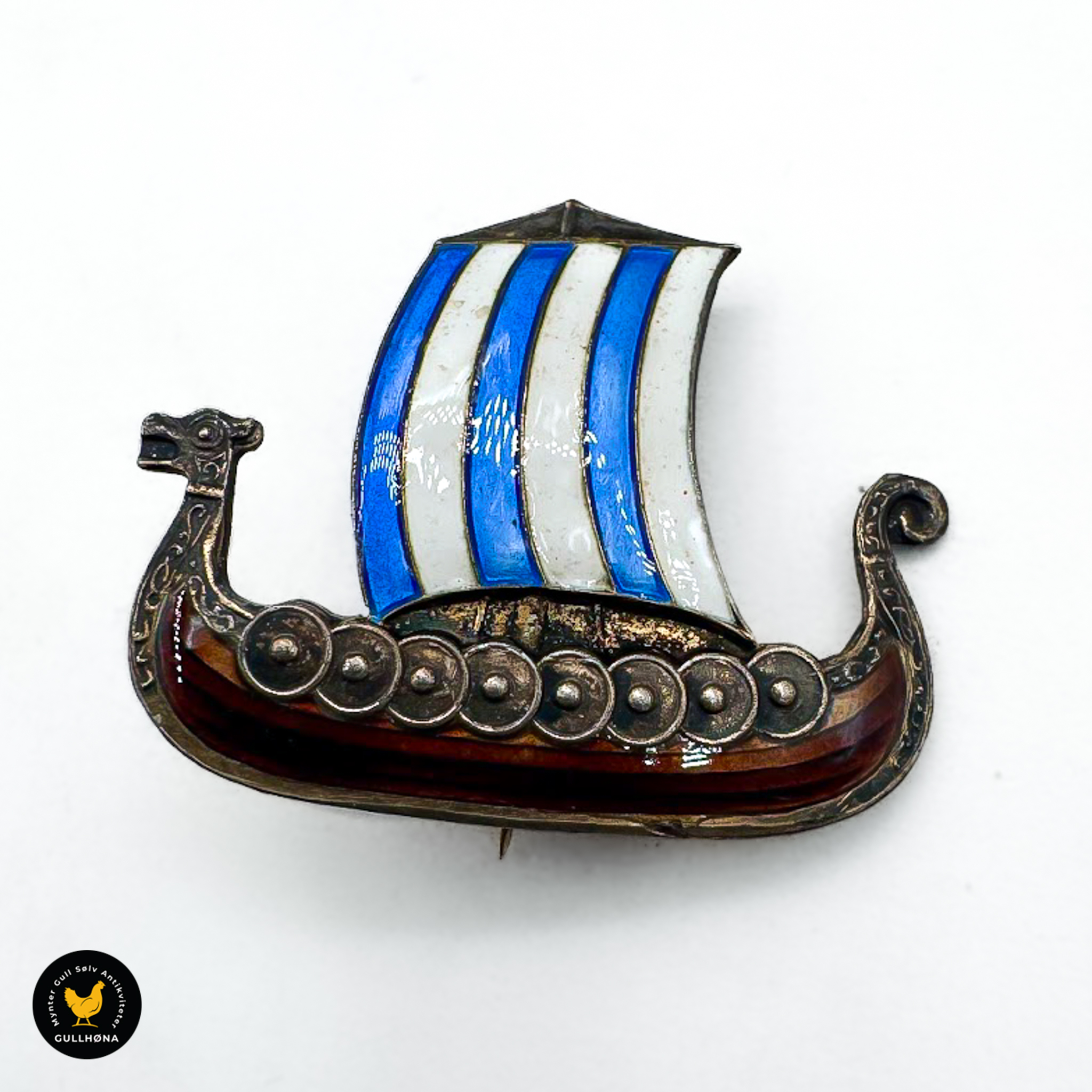 Brosje i forgylt sølv med rød/brun, hvit og blå emalje – Aksel Holmsen – Vikingskip