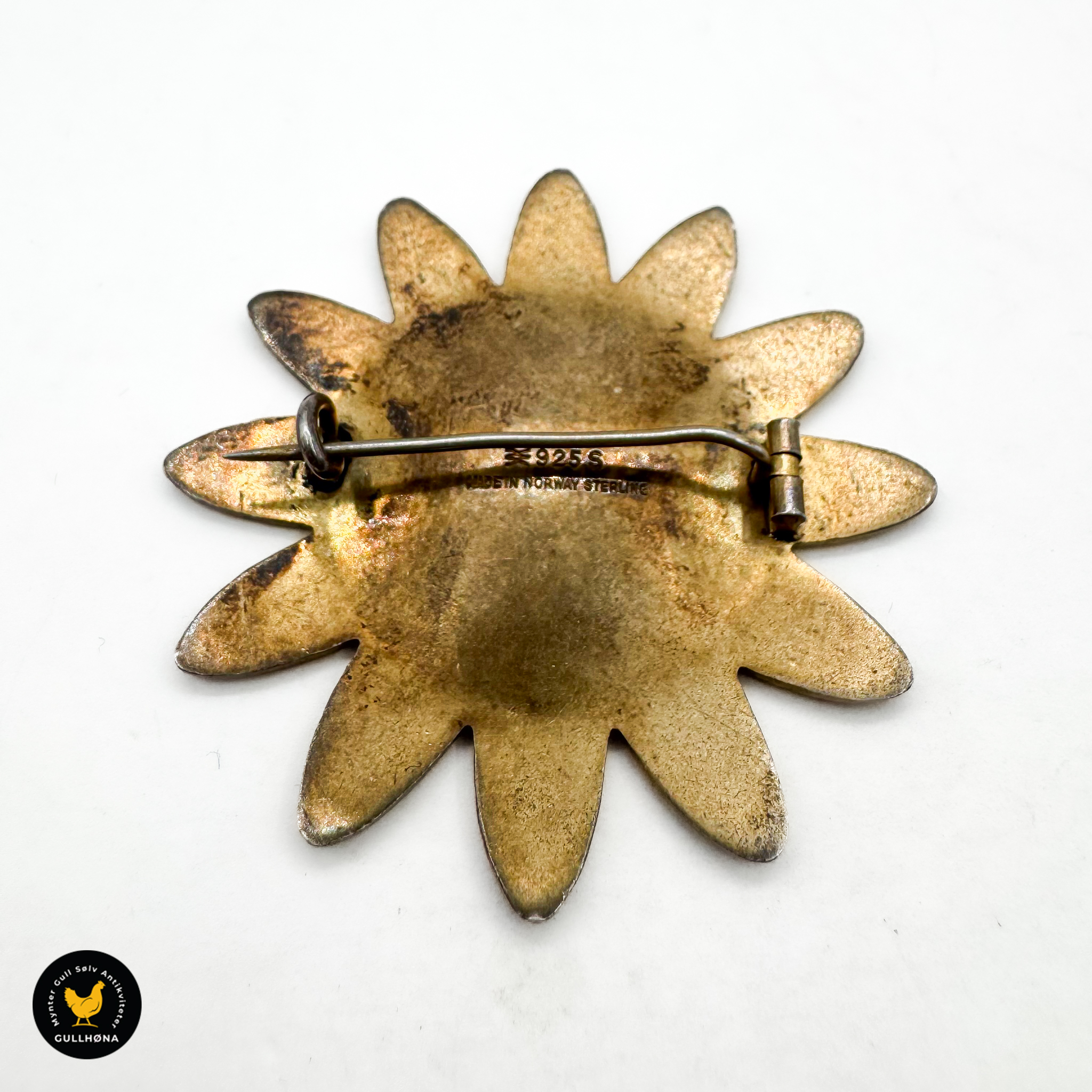 Liten bøy på nålen, men fungerer som den skal. Normal bruksslitasje. Emaljen er i veldig god stand.