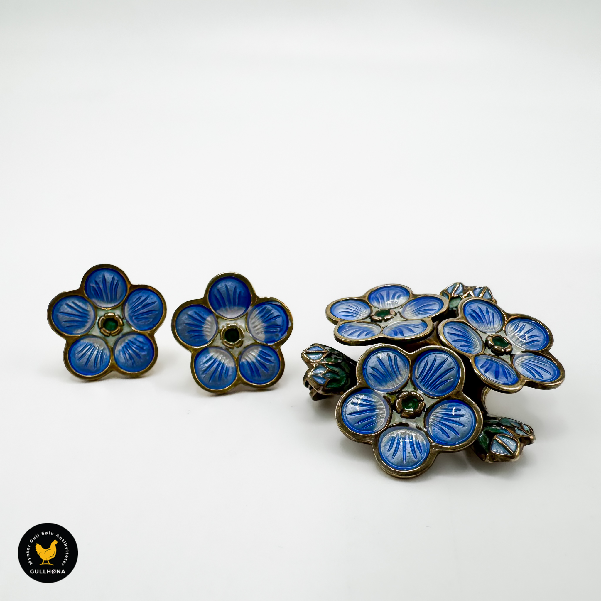 Brosje og øredobber i forgylt sølv med emalje – Forglemmegei. Disse øredobbene ser vi sjeldent til!