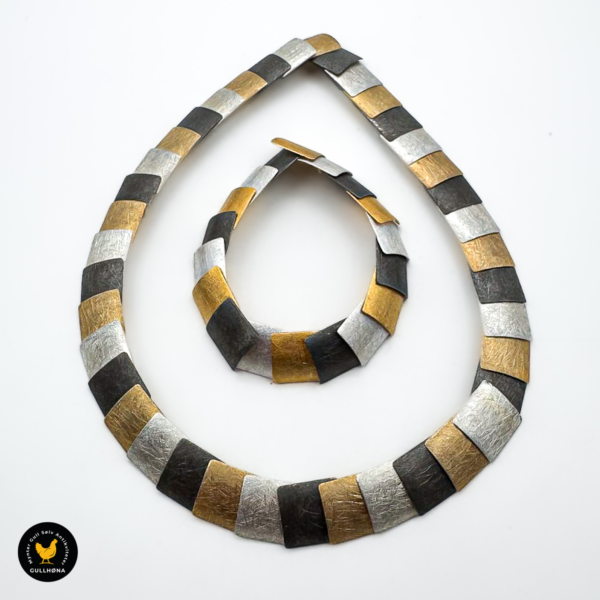 Lengde kjede: ca. 41,5 cm. Lengde armbånd: ca. 19,5 cm. Bredde på begge deler 1,6 cm