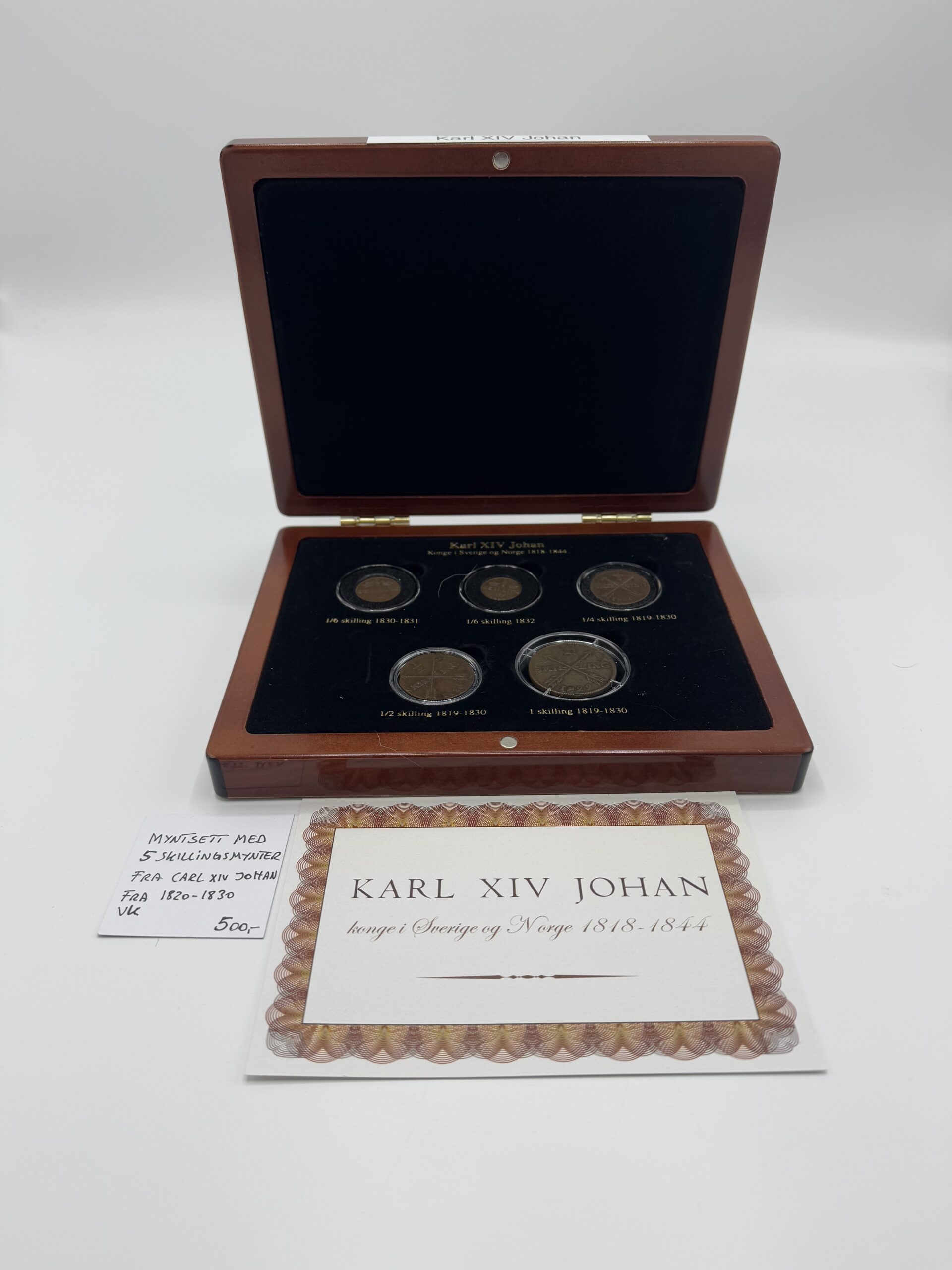 Myntsett med 5 skillingsmynter (år 1820-1830) fra regjeringstiden til Carl XIV Johan.