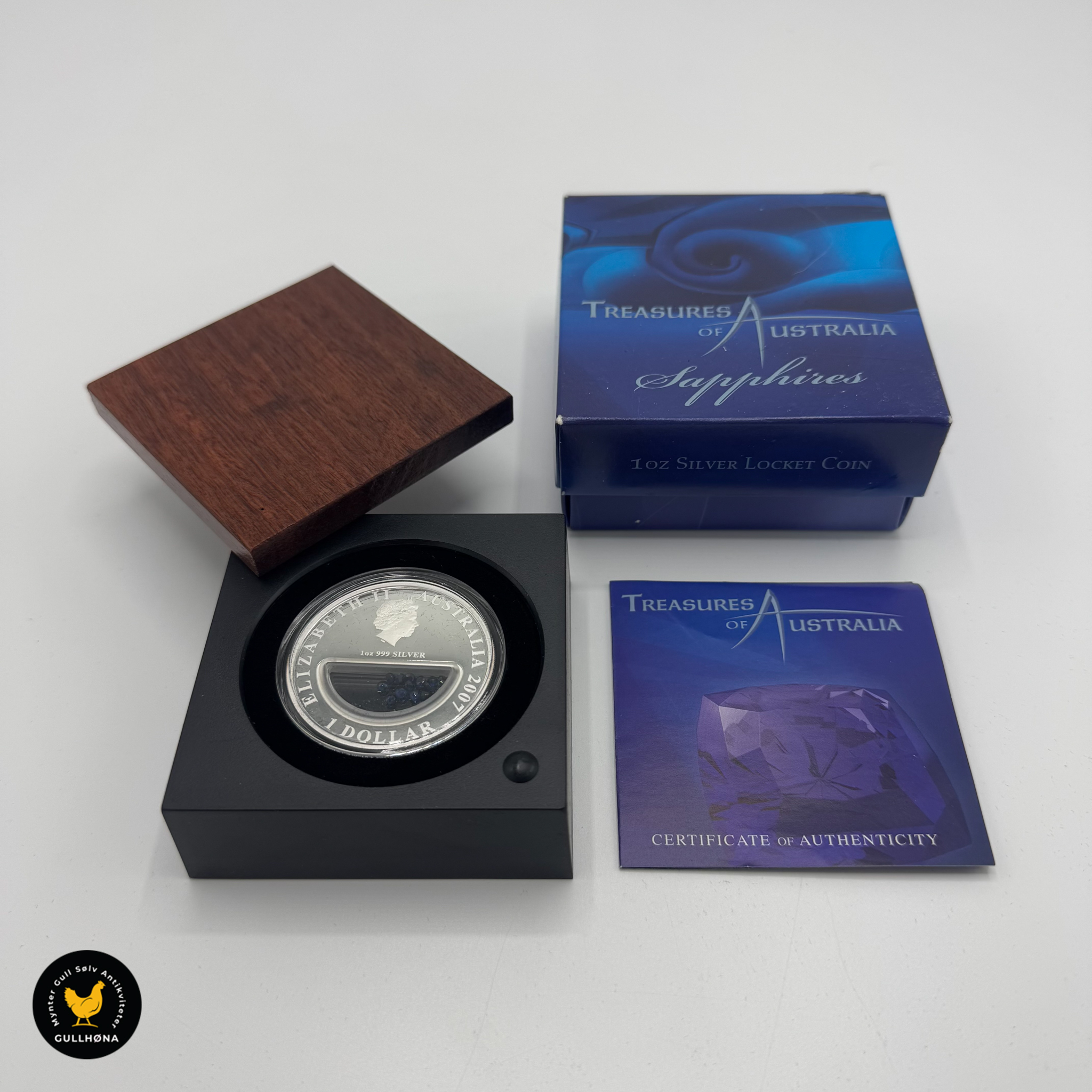 1 stykk 1 oz .999 sølvmynt i proof-kvalitet med innfelte Australske blå safirer.