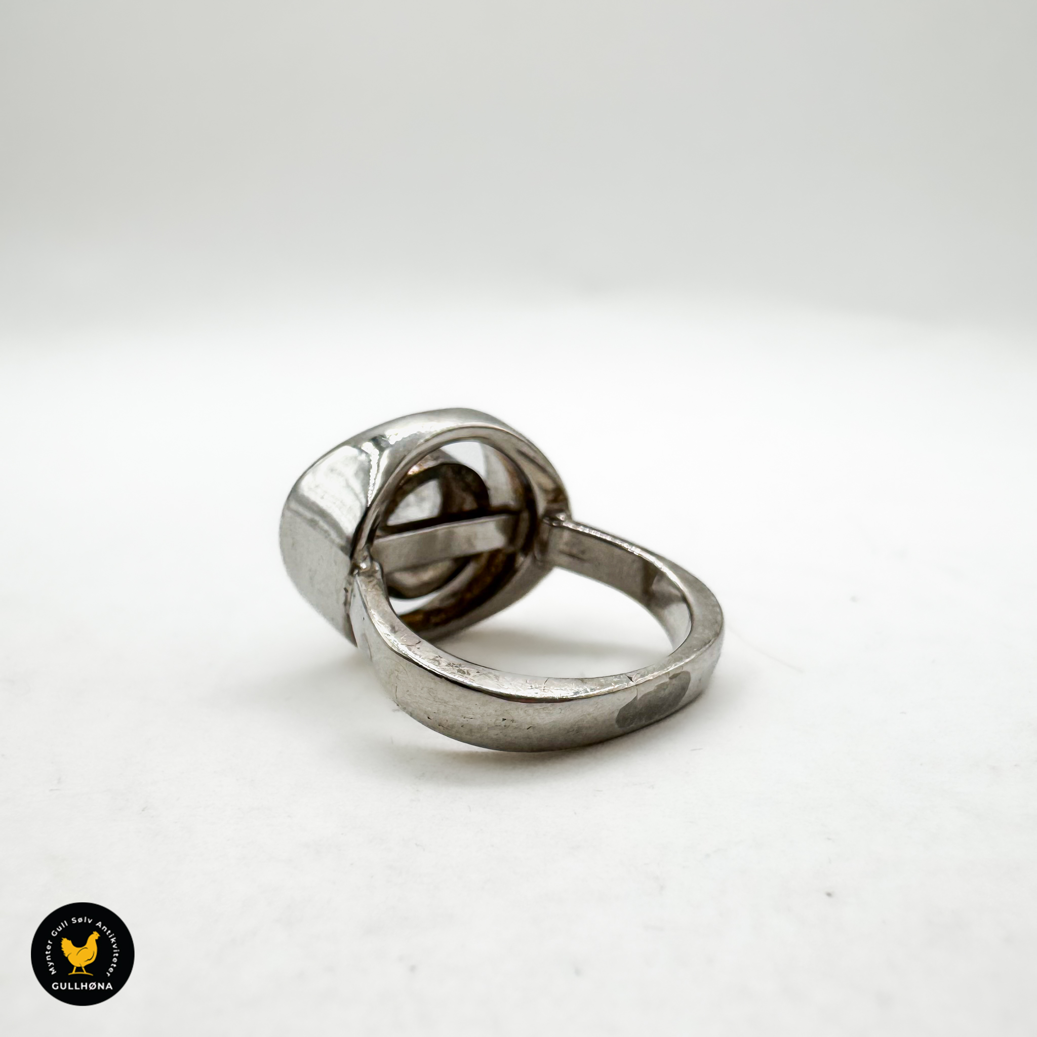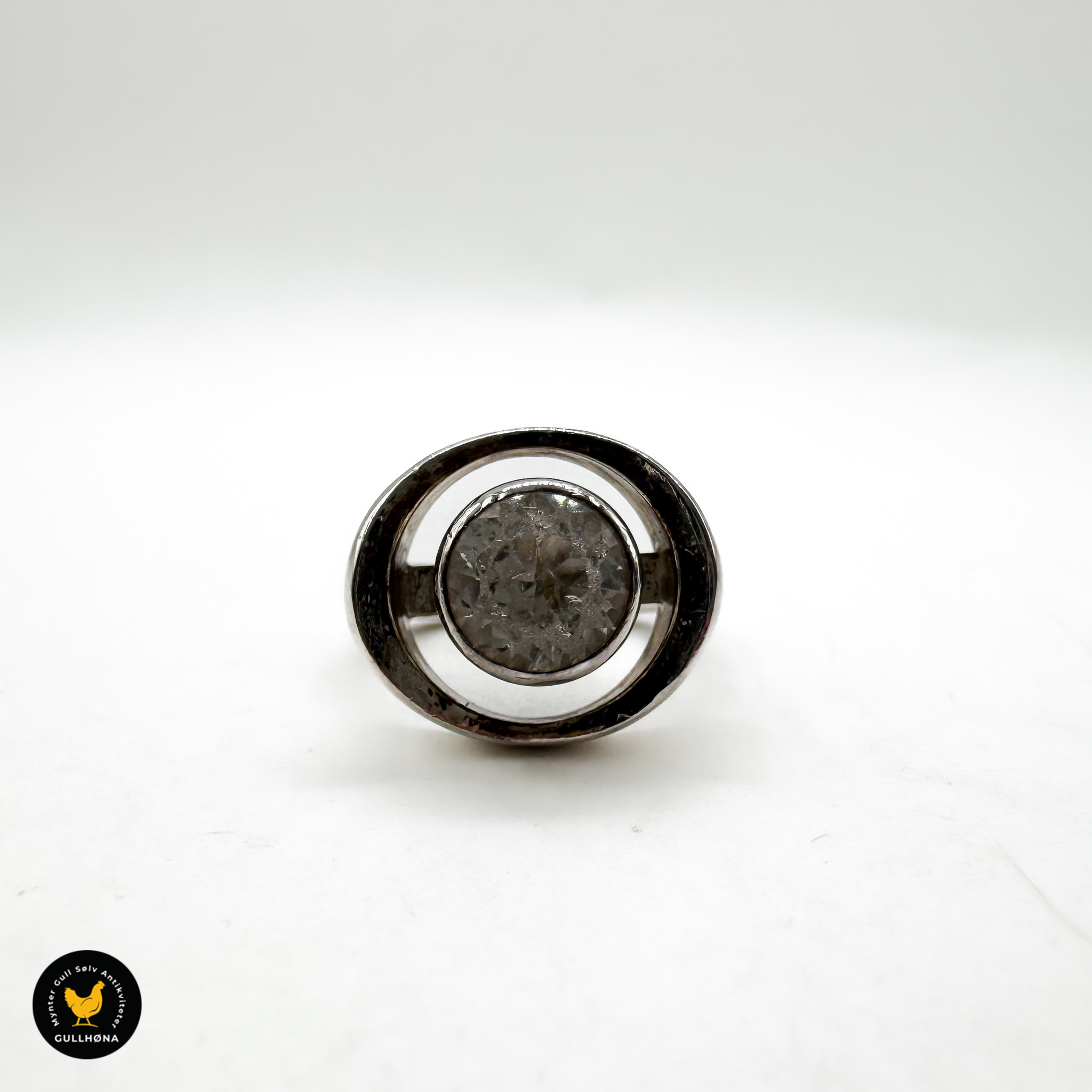 Brukt. Normal bruksslitasje. Steinen (sannsynligvis glass) har tydelig slitasje med riper, men fremstår som hel. Selges som den er. Produktet er renset.