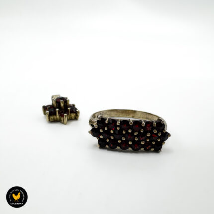 Ring og anheng i forgylt sølv med granater