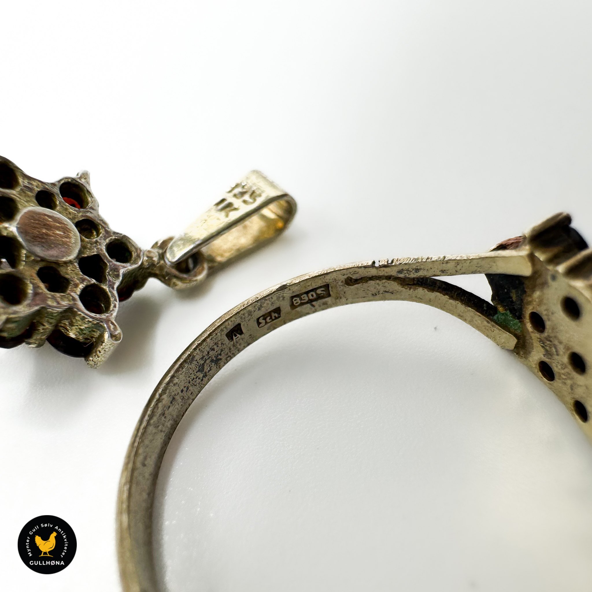 Sett med en flott ring og søtt anheng i forgylt sølv og granater.