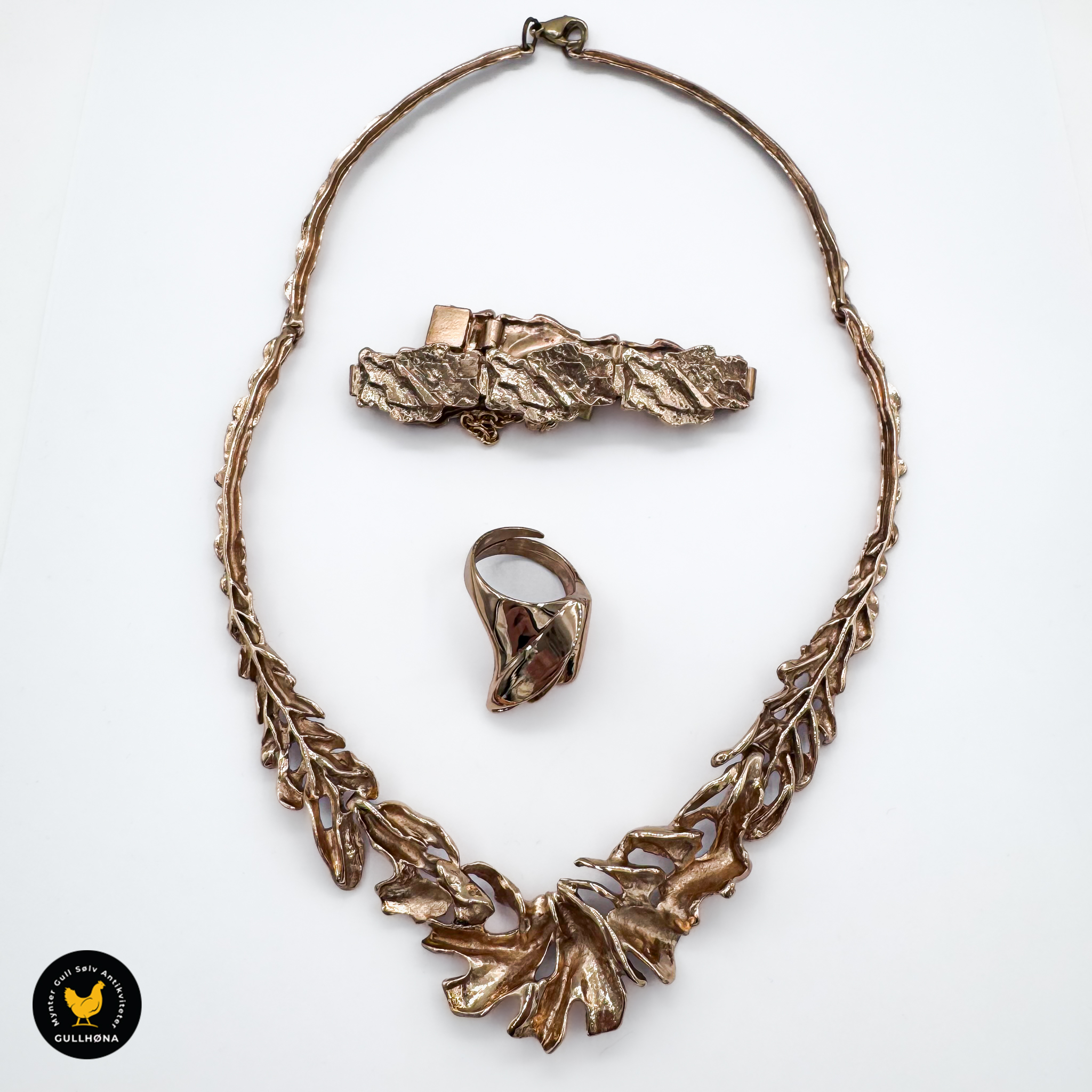 Flott sett med i bronse (kobber + tinn), med ring halssmykke og armlenke fra Kalevi Sara/Salovaara. Mange spennende detaljer!