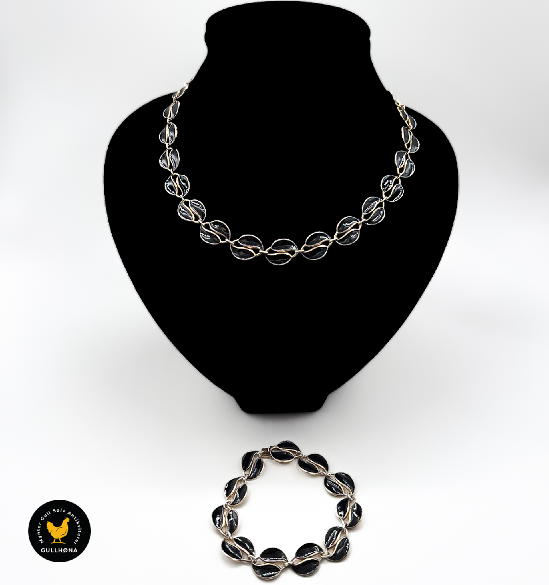 Halskjede, armbånd i forgylt sølv, dobbel bladranke med hvit emalje. Willy Winnæs for David-Andersen, 1950-tall.